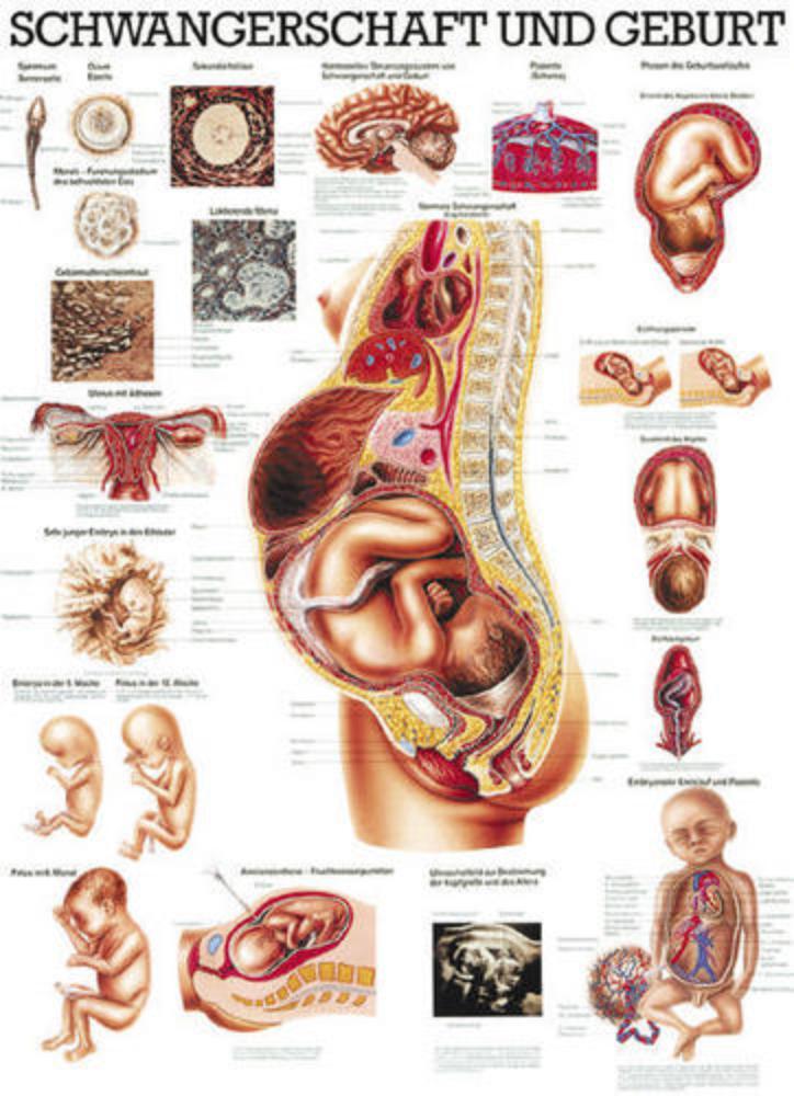 • Farbige Darstellung der Samenzelle, Eizelle, Sekundärfollikel, Furchungsstadium, Gebärmutterschleimhaut, Laktierende Mama, Embryo 9. Woche/12. Woche, Fötus 6. Monat, Fruchtwasserpunktierung, Ultraschallbild, Phasen der Geburt