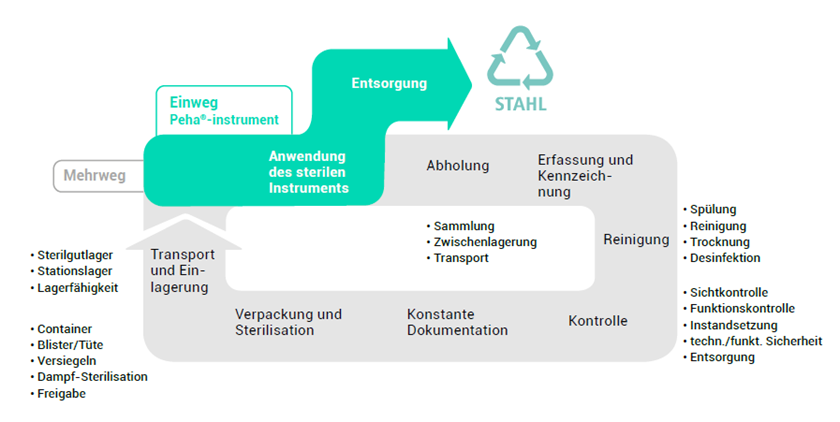 Der Einsatz von Mehrweginstrumenten in Kliniken und Arztpraxen bedeutet einen erheblichen Ressourcen- und Zeitaufwand. Der Einsatz von Einweginstrumenten wie Peha®-instrument reduziert die Zahl der Prozessschritte deutlich und erleichtert damit die täglichen Abläufe.
